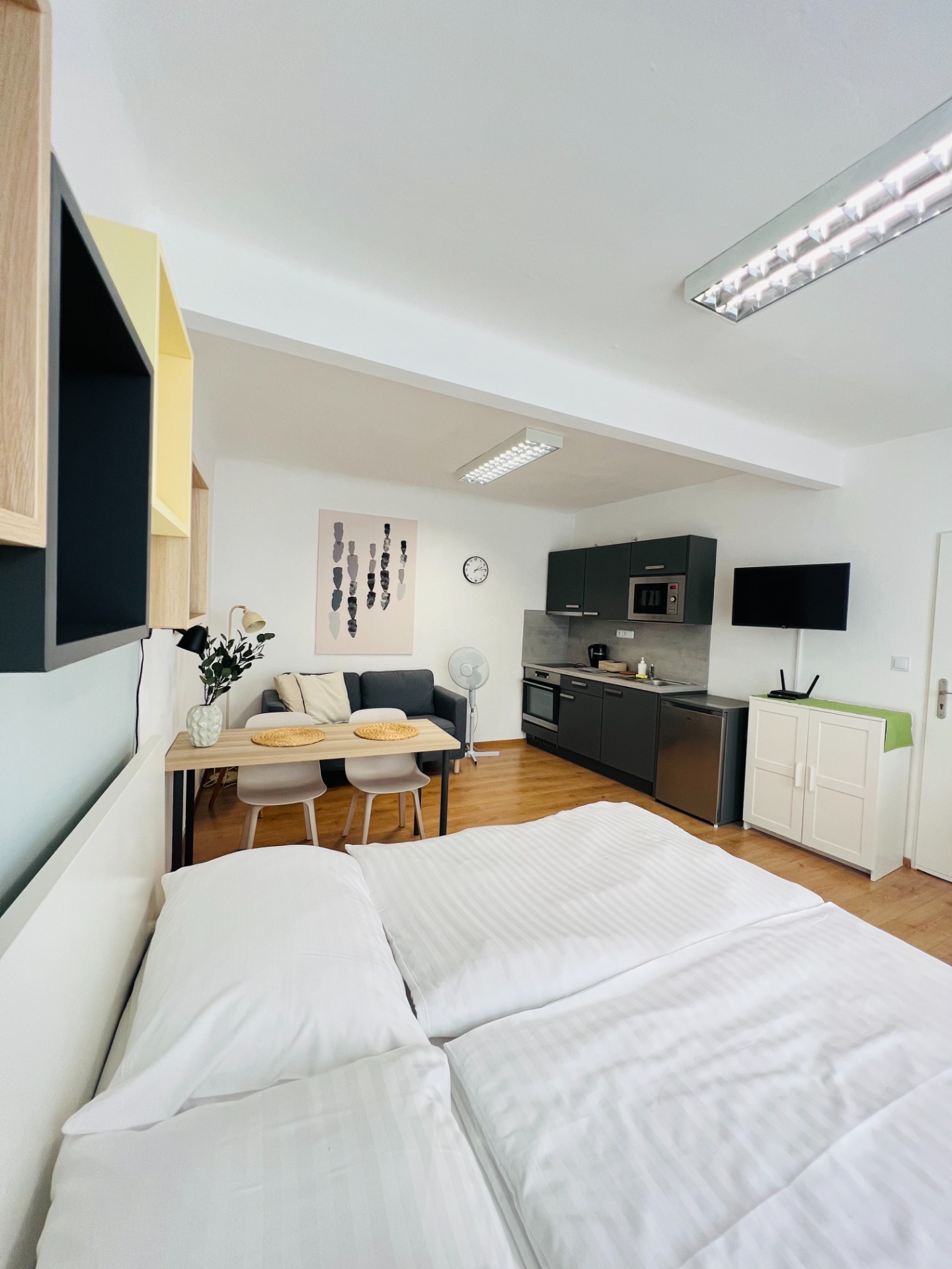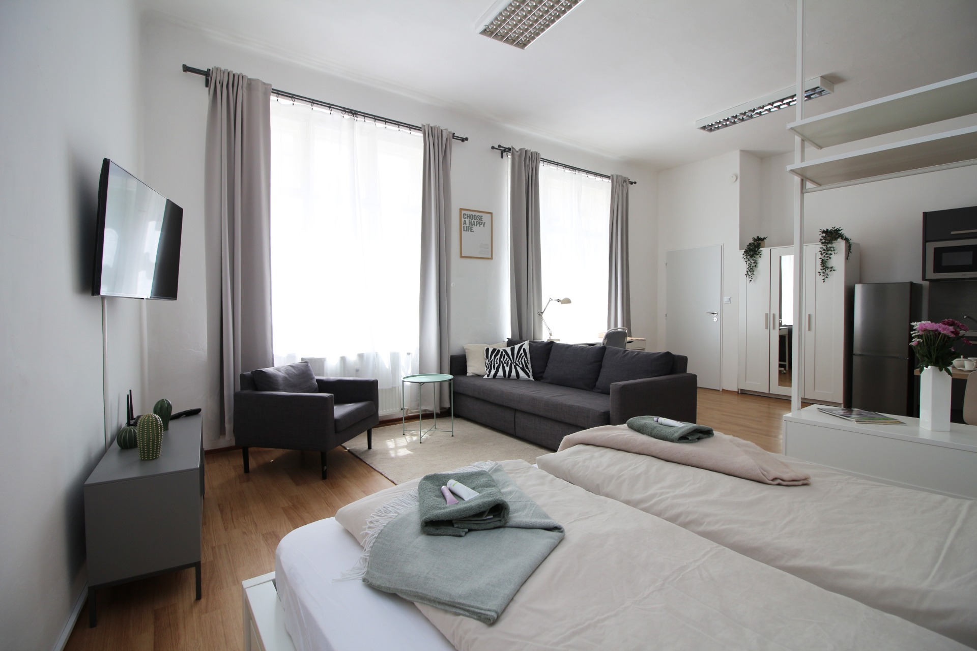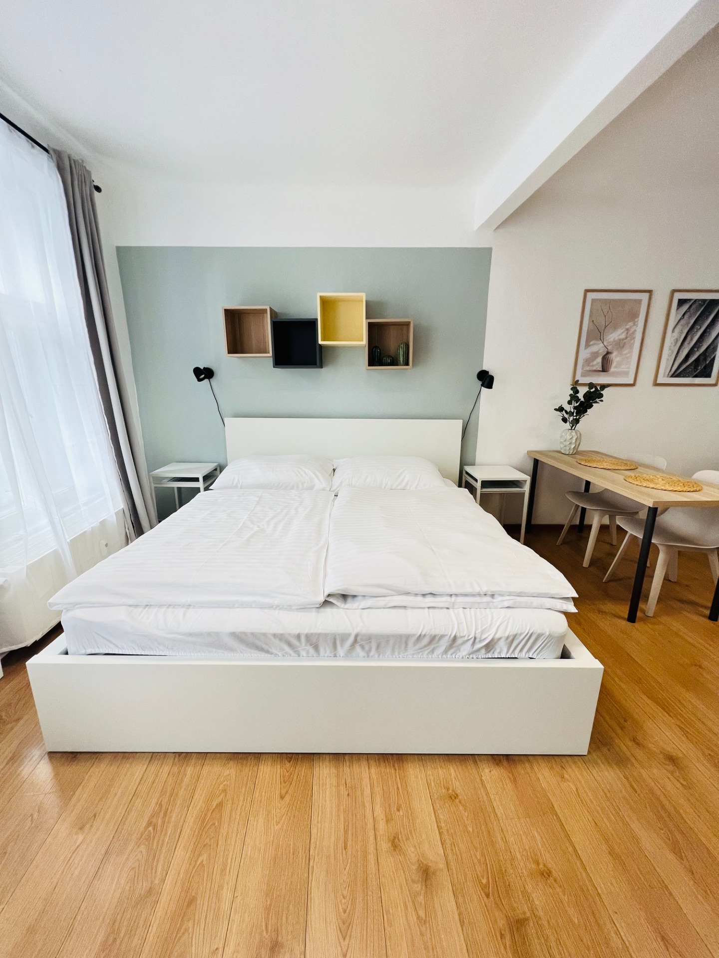 The 35 m2 1+kk bedroom apartment is equipped with a comfortable double bed, storage cabinets, sofa and armchairs for rest