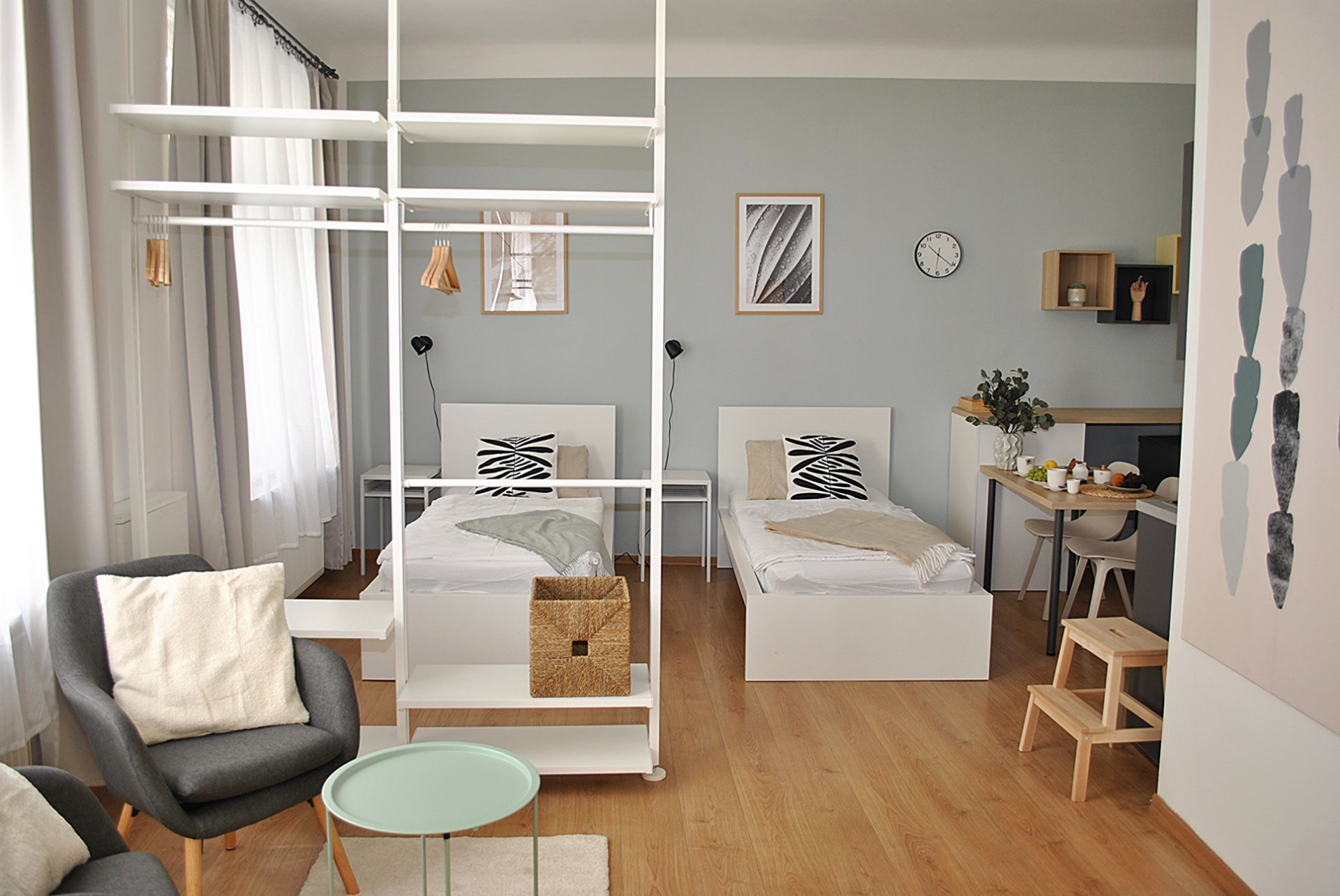 The 35 m2 1+kk bedroom apartment is equipped with two single comfortable beds, storage cabinets, armchairs for rest