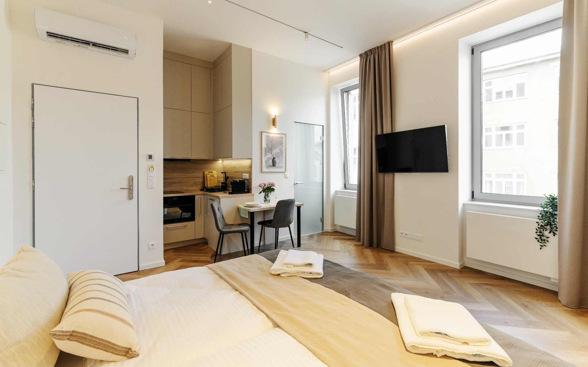 Apartmán č. 302 nabízí vše, co si od stylového ubytování v samém srdci města dokážete představit. Tento moderně zařízený interiér nabízí manželskou postel, plně vybavený kuchyňský kout a elegantní koupelnu se sprchovým koutem i pračkou.
