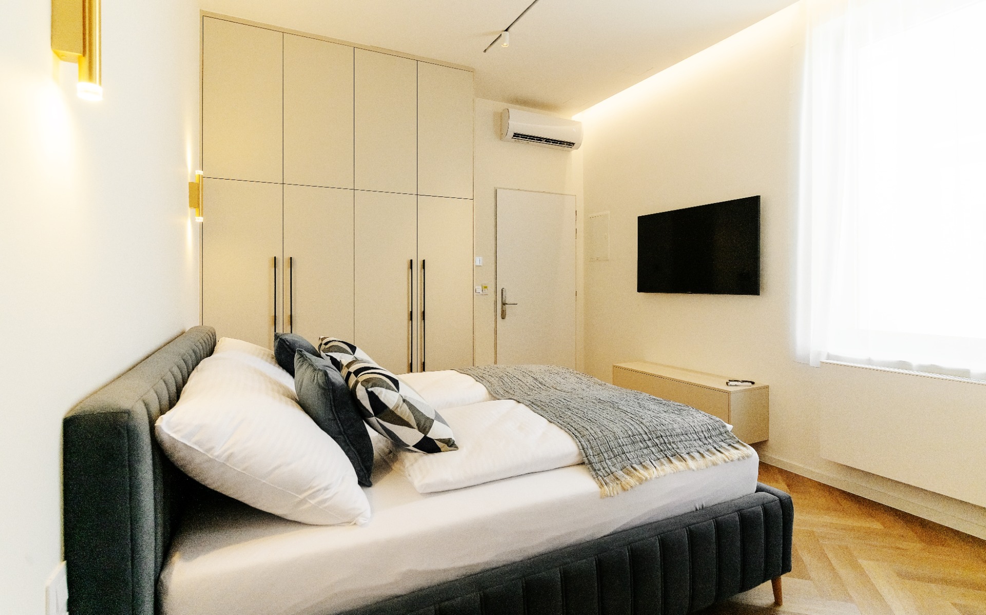 Apartmán č. 401 nabízí vše, co si od stylového ubytování v samém srdci města dokážete představit. Tento moderně zařízený interiér nabízí manželskou postel, plně vybavený kuchyňský kout a elegantní koupelnu se sprchovým koutem i pračkou.
