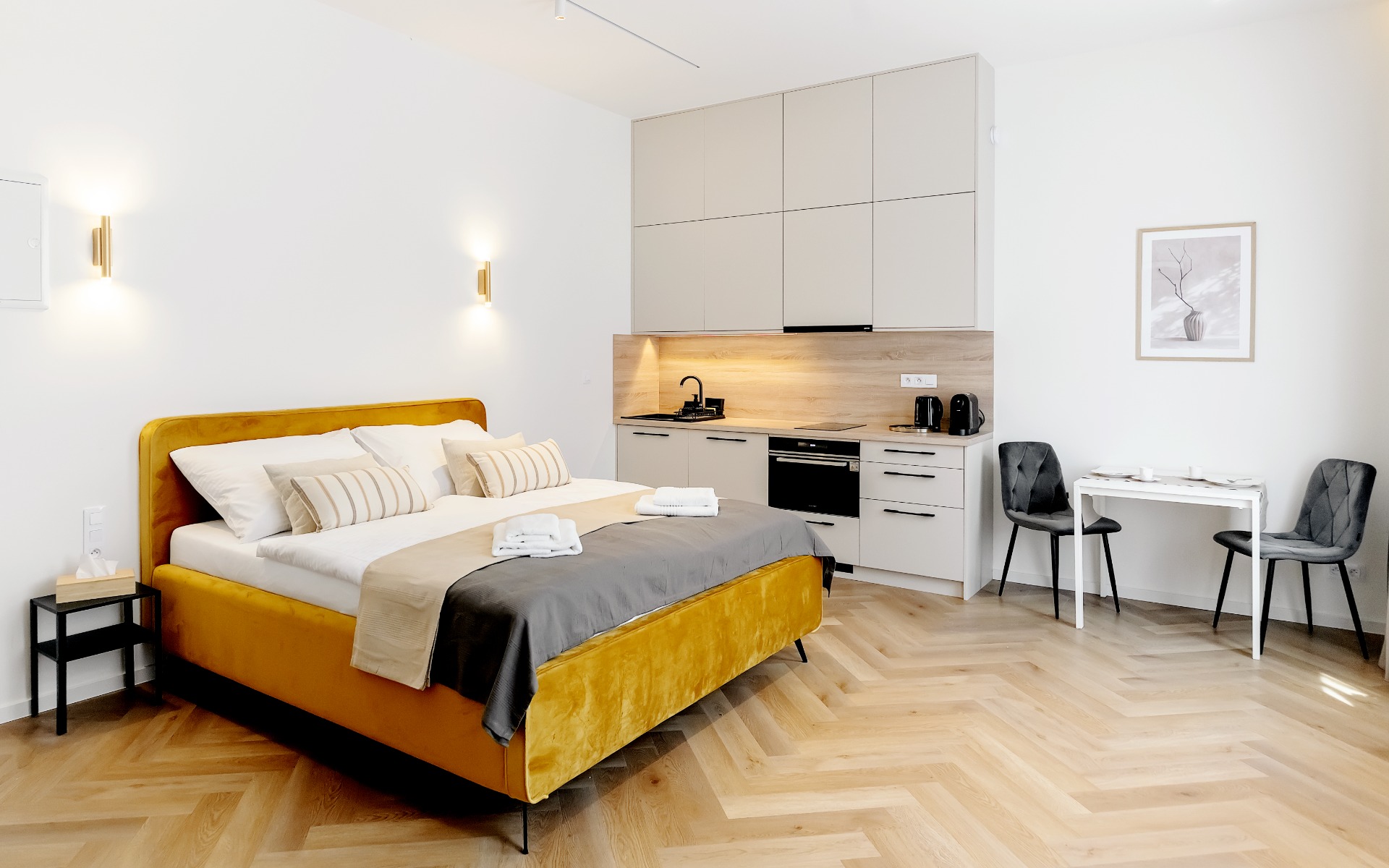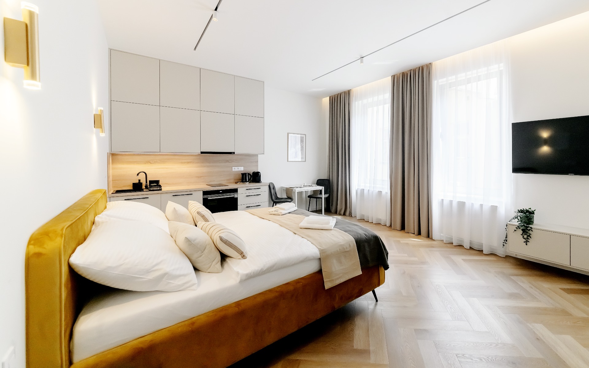 Apartmán č. 403 nabízí vše, co si od stylového ubytování v samém srdci města dokážete představit. Tento moderně zařízený interiér nabízí manželskou postel, plně vybavený kuchyňský kout a elegantní koupelnu se sprchovým koutem i pračkou.